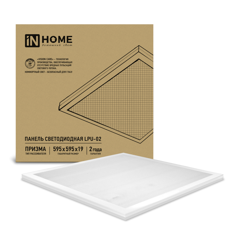 Универсальная светодиодная панель LPU-02 ПРИЗМА ТМ IN HOME для потолков «Армстронг» – это экономия, долговечность и прекрасная замена люминесцентных светильников. Благодаря простоте установки и отличному сочетанию цена-качество заслуженно является самым популярным светильником для офисного освещения. Потолочные светильники в стальном корпусе, окрашенном белой порошковой краской имеют типовые квадратные размеры 595х595 при высоте 19мм, такие габариты позволяют эффективно экономить потолочное пространство при встраиваемом способе и быть максимально незаметным, аккуратным — при накладном способе монтажа. ЭПРА (драйвер) встроен в корпус светильника и не мешает распределению светового потока, что значительно улучшает визуальное восприятие. Линейка LPU-02 INHOME представлена в диапазоне мощностей от 36 до 100Вт с вариациями цветовых температур нейтрального (4000К) и холодного (6500К) спектра дневного света. Высокоэффективные светодиоды нового поколения обеспечивают высокую светоотдачу и долгий срок службы (с среднем не менее 30 000 часов). Панели обеспечивают существенную экономию потребляемой энергии, снижение эксплуатационных расходов за счет продолжительного срока службы без дополнительного обслуживания. Панель экологически безопасна, что означает отсутствие затрат на специальную утилизацию. Технология изготовления обеспечивает отсутствие вредных для человека пульсаций светового потока (не мерцает во включенном состоянии). Призматический рассеиватель из прозрачного светостабилизированного полистирола не желтеет со временем, а так же равномерно и мягко рассеивает световой поток. Прибор имеет встроенную защиту от скачков напряжения. Панель встраивается в стандартную ячейку подвесного потолка типа «Армстронг» либо монтируется на опорную поверхность накладным способом. ЭПРА (драйвер) в комплекте (встроен в корпус панели). Гарантия на изделия составляет 2 года с момента покупки. Преимущества — Высокая экономичность — Встроенная защита от скачков напряжения — Универсальный монтаж — Встроенный в корпус драйвер не мешающий распределению светового потока. — Равномерное свечение — Отсутствие пульсации и мерцания — Соответствие регламенту ТС ЕАС