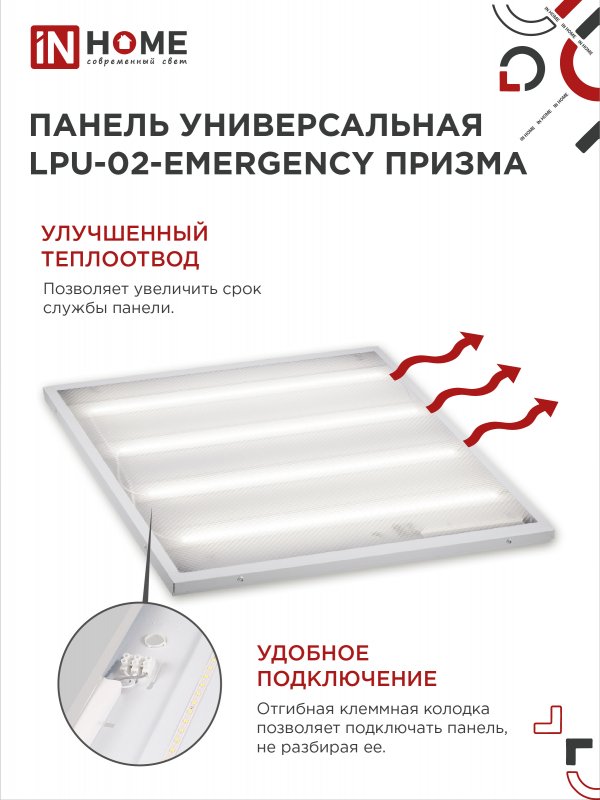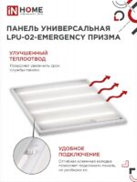 Характеристики Панель светодиодная универсальная LPU-02-EMERGENCY 36Вт ПРИЗМА 230В 6500К 3420Лм 595х595х19мм IP40 IN HOME без БАП-10W90: