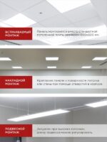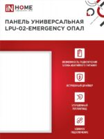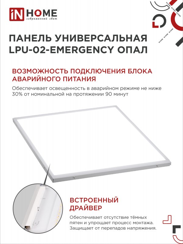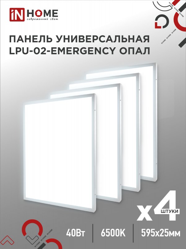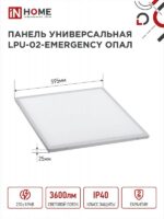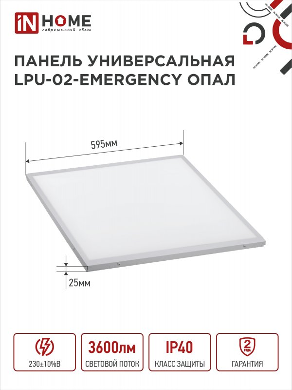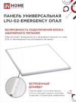 Характеристики Панель светодиодная универсальная LPU-02-EMERGENCY 40Вт ОПАЛ 230В 6500К 3600Лм 595х595х25мм IP40 IN HOME без БАП-10W90: