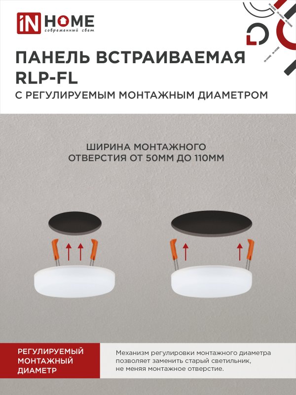 Характеристики Панель светодиодная встраиваемая безрамочная RLP-FL 18Вт 230В 4000К 1620Лм 120мм с регулируемым монтажом 45-100мм белая IP20 IN HOME:
