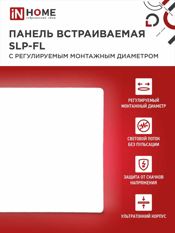 Характеристики Панель светодиодная встраиваемая безрамочная SLP-FL 36Вт 230В 4000К 3240Лм 226мм с регулируемым монтажом 45-190мм белая IP20 IN HOME: