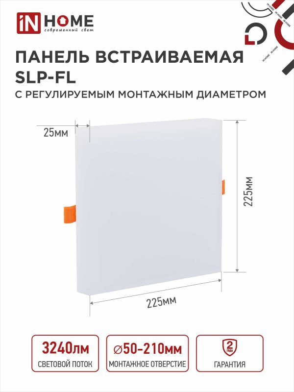 Характеристики Панель светодиодная встраиваемая безрамочная SLP-FL 36Вт 230В 6500К 3240Лм 226мм с регулируемым монтажом 45-190мм белая IP20 IN HOME: