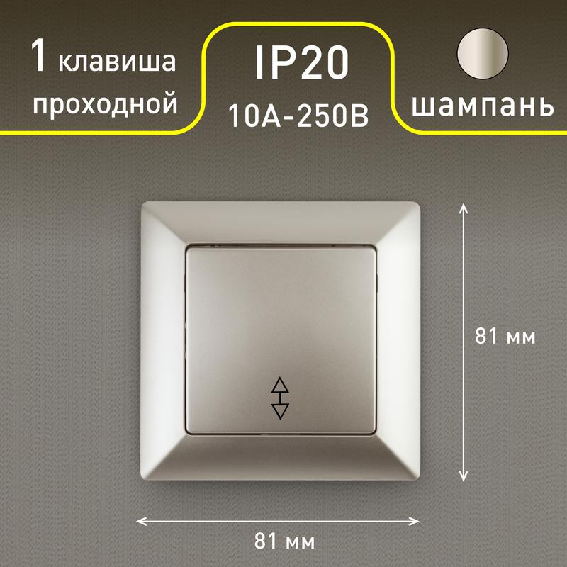 Характеристики Переключатель Intro Solo 4-103-04 одноклавишный 10А-250В, IP20, СУ, шампань: