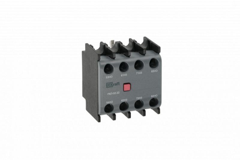 Приставка контактная серии ПКЛ-02-22 для контакторов КМ-102 DEKraft; кол-во контактов — 2НО и 2НЗ; ном.ток 10 А; ном.напряжение до 690 В; установка с лицевой стороны; степень защиты IP20. Приставки контактные предназначены для увеличения количества вспомогательных контактов контактора. Контактные приставки механически соединяются с контакторами и фиксируются при помощи защелки. Приставка подходит для использования с контакторами других производителей.