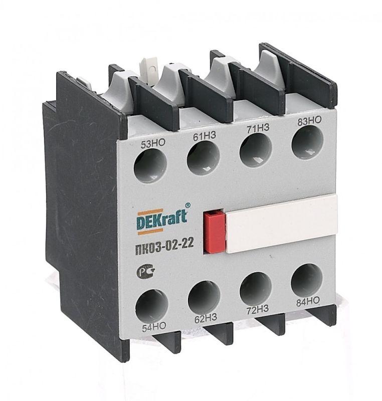 Приставка контактная серии ПК-03-02 для контакторов КМ-103 DEKraft; кол-во контактов — 2НО+2НЗ; ном.ток – 10 А; ном.напряжение – до 690 В; установка – с лицевой стороны; степень защиты – IP20. Приставки контактные предназначены для увеличения количества вспомогательных контактов контактора. Контактные приставки механически соединяются с контакторами и фиксируются при помощи защелки. Приставка подходит для использования с контакторами других производителей.