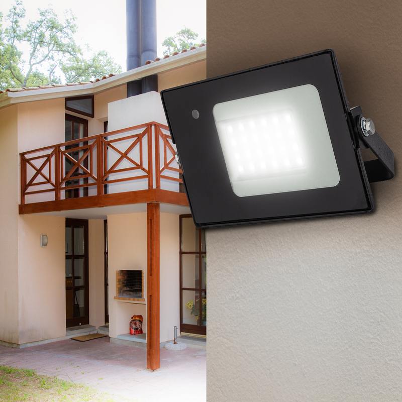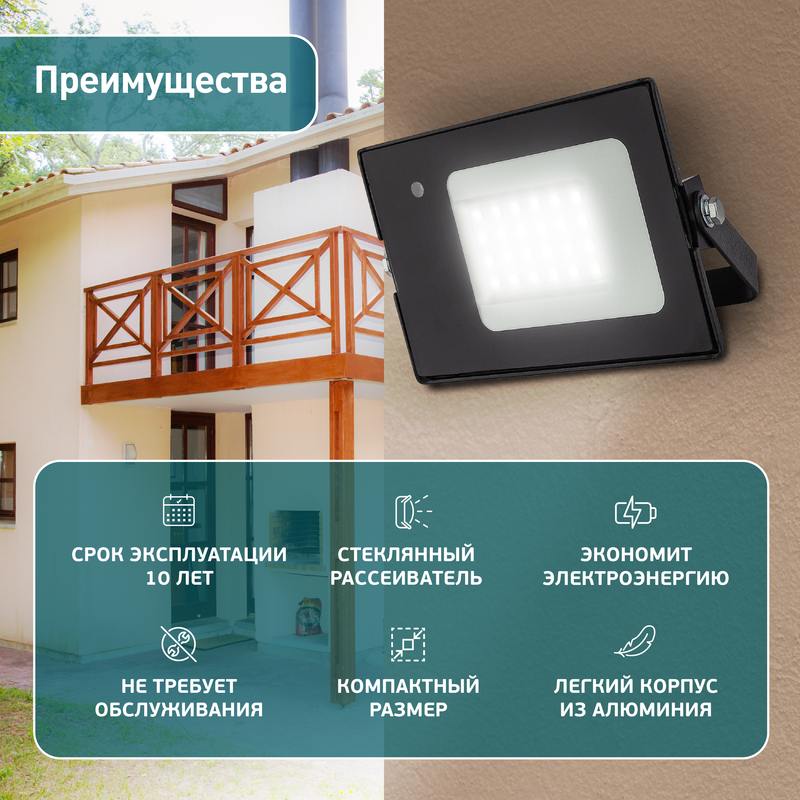 Прожектор светодиодный уличный с датчиком движения (СДО) ЭРА LPR-041-1-65K-020 мощность 20 Вт, с цветовой температурой 6500К (холодный белый свет), пылевлагозащитой IP65 (защищен от пыли и струй воды с любого направления), световым потоком 1400 Лм. Микроволновый датчик реагирует на движение в зоне действия (радиус срабатывания — до 6м) и автоматически включает освещение (время задержки — 30-40с). Корпус изготовлен из анодированного алюминия с покраской в черный цвет. Стекло — закаленное. LED технология обеспечивает длительный срок службы и экономию электроэнергии. Светильник работает в широком диапазоне рабочих напряжений — 200-240В, а также широком диапазоне температу от -45 до +40 — подходит как для внутреннего, так и наружного применения. Предназначен как для промышленного, так и для бытового освещения: дворов, подсобных помещений, приусадебных хозяйств, билбородов, в качестве уличного фонаря.