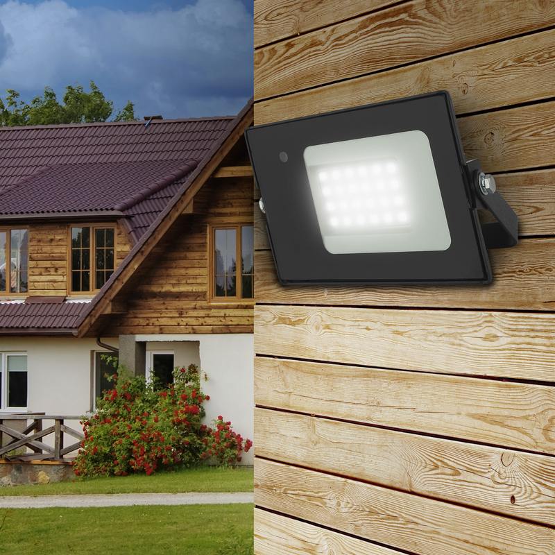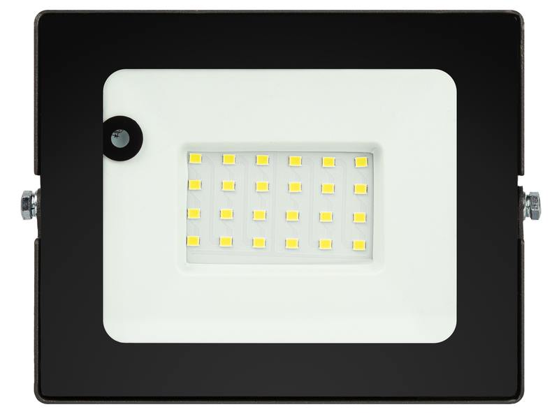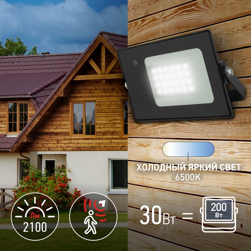 Прожектор светодиодный уличный с датчиком движения (СДО) ЭРА LPR-041-1-65K-030 мощность 30 Вт, с цветовой температурой 6500К (холодный белый свет), пылевлагозащитой IP65 (защищен от пыли и струй воды с любого направления), световым потоком 2100 Лм. Микроволновый датчик реагирует на движение в зоне действия (радиус срабатывания — до 6м) и автоматически включает освещение (время задержки — 30-40с). Корпус изготовлен из анодированного алюминия с покраской в черный цвет. Стекло — закаленное. LED технология обеспечивает длительный срок службы и экономию электроэнергии. Светильник работает в широком диапазоне рабочих напряжений — 200-240В, а также широком диапазоне температур от -45 до +40 — подходит как для внутреннего, так и наружного применения. Предназначен как для промышленного, так и для бытового освещения: дворов, подсобных помещений, приусадебных хозяйств, билбордов, в качестве уличного фонаря.