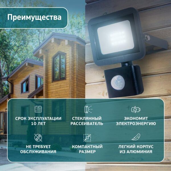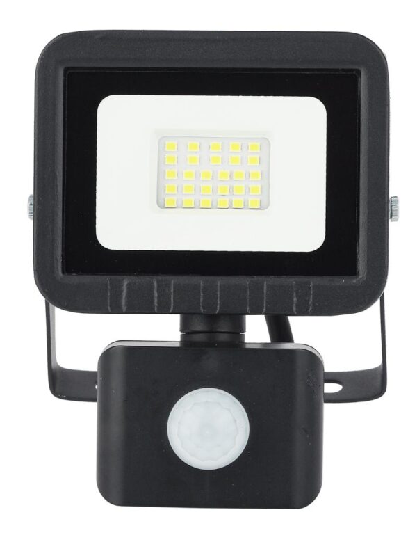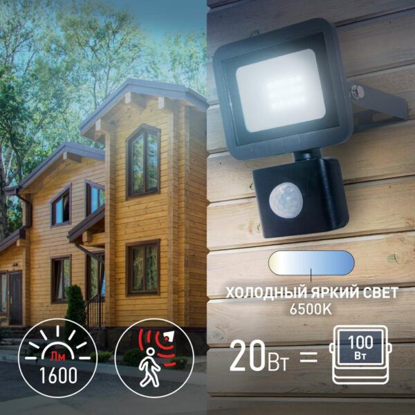 Прожектор светодиодный уличный с выносным регулируемым датчиком движения (СДО) ЭРА LPR-041-2-65K-020 мощность 20 Вт, с цветовой температурой 6500К (холодный белый свет), пылевлагозащитой IP65 (защищен от пыли и струй воды с любого направления), световым потоком 1600 Лм. Инфракрасный датчик реагирует на движение в зоне действия (радиус срабатывания от 1 до 8м) и автоматически включает освещение (время задержки от 5сек до 8мин). Корпус изготовлен из анодированного алюминия с покраской в черный цвет. Стекло — закаленное. LED технология обеспечивает длительный срок службы и экономию электроэнергии. Светильник работает в широком диапазоне рабочих напряжений — 200-240В, а также широком диапазоне температу от -45 до +40 — подходит как для внутреннего, так и наружного применения. Предназначен как для промышленного, так и для бытового освещения: дворов, подсобных помещений, приусадебных хозяйств, билбородов, в качестве уличного фонаря.