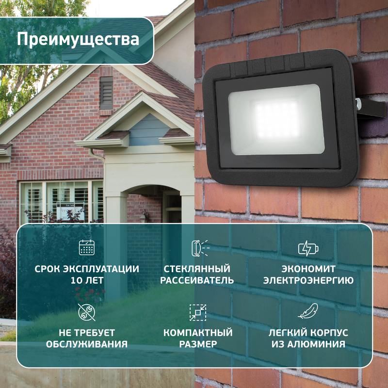 Прожектор светодиодный уличный (СДО) ЭРА LPR-061-0-65K-020 мощность 20 Вт, с цветовой температурой 6500К (холодный белый свет), пылевлагозащитой IP65 (защищен от пыли и струй воды с любого направления), световым потоком 1900 Лм. Корпус изготовлен из анодированного алюминия с покраской в черный цвет. Стекло — закаленное. LED технология обеспечивает длительный срок службы и экономию электроэнергии. Светильник работает в широком диапазоне рабочих напряжений — 200-240В, а также широком диапазоне температу от -40 до +45 — подходит как для внутреннего, так и наружного применения. Предназначен как для промышленного, так и для бытового освещения: дворов, подсобных помещений, приусадебных хозяйств, билбородов, в качестве уличного фонаря.