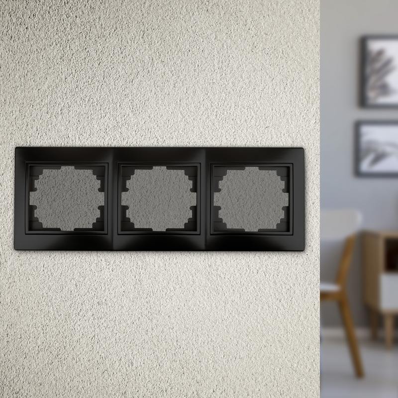 Рамка выполнена из термопласта. Устанавливается на 3 устройства серии Intro Plano, смонтированные в два горизонтально установленных подрозетника.