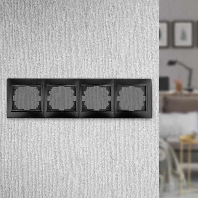 Рамка выполнена из термопласта. Устанавливается на 4 устройства серии Intro Plano, смонтированные в два горизонтально установленных подрозетника.