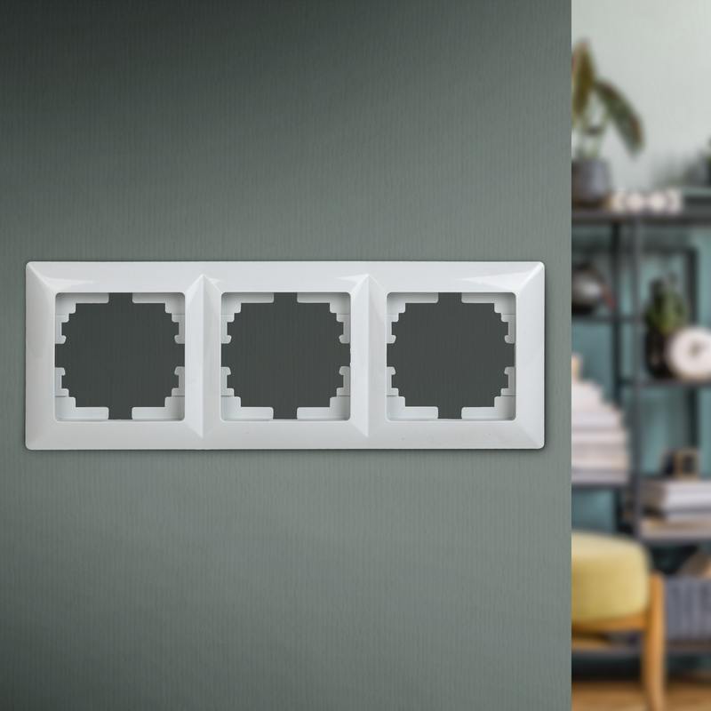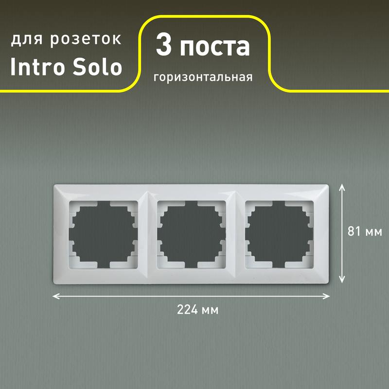 Рамка выполнена из термопласта. Устанавливается на 3 устройства серии Intro Solo, смонтированные в два горизонтально установленных подрозетника.