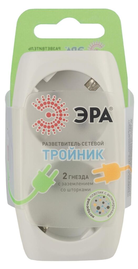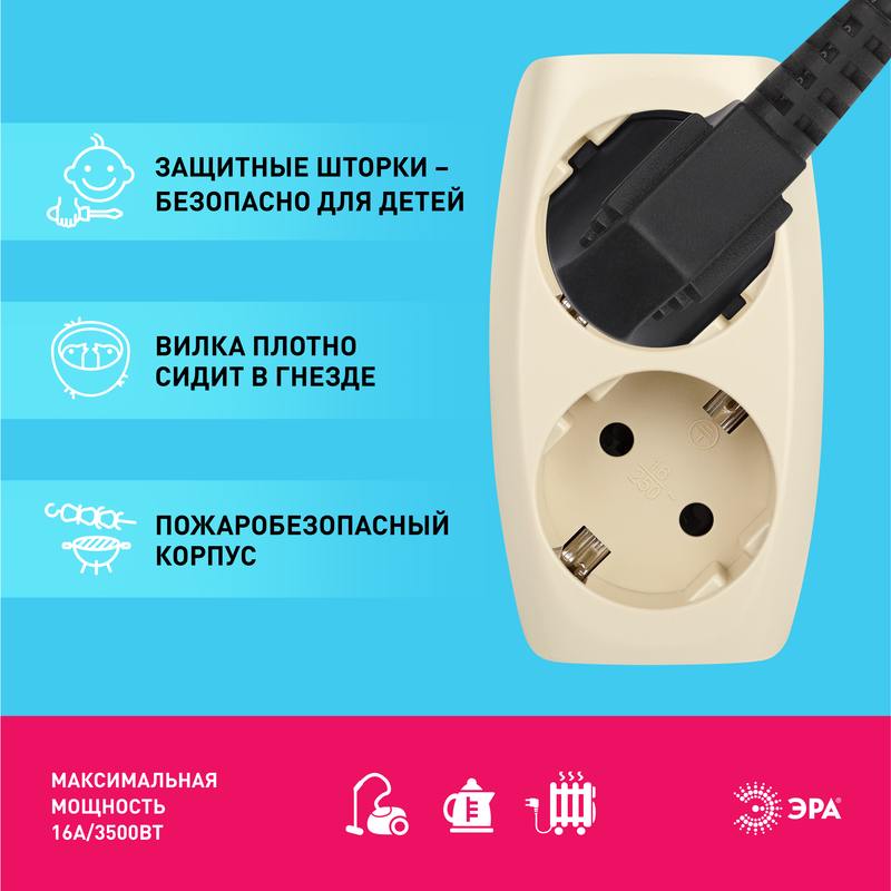 Разветвитель электрический Эра SP-2e-I с заземлением, 2 розетки, слоновая кость. Если в Вашем доме недостаточно розеток, чтобы одновременно подключить несколько электроприборов, то тройник марки Эра станет Вашим надежным помощником. Электрический разветвитель расчитан на максимальную мощность 16А/3500Вт. Корпус выполнен из ударопрочного и негорючего пластика (поликарбонат). Модель тройника на 16А позволяет подключить мощные бытовые приборы общей нагрузкой до 3500Вт. Не бойтесь включить чайник, обогреватель или микроволновку. Дизайн разработан в России командой Эра Style.