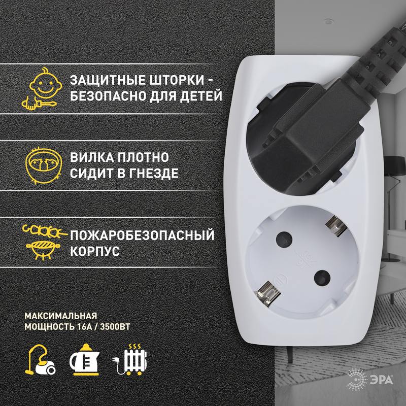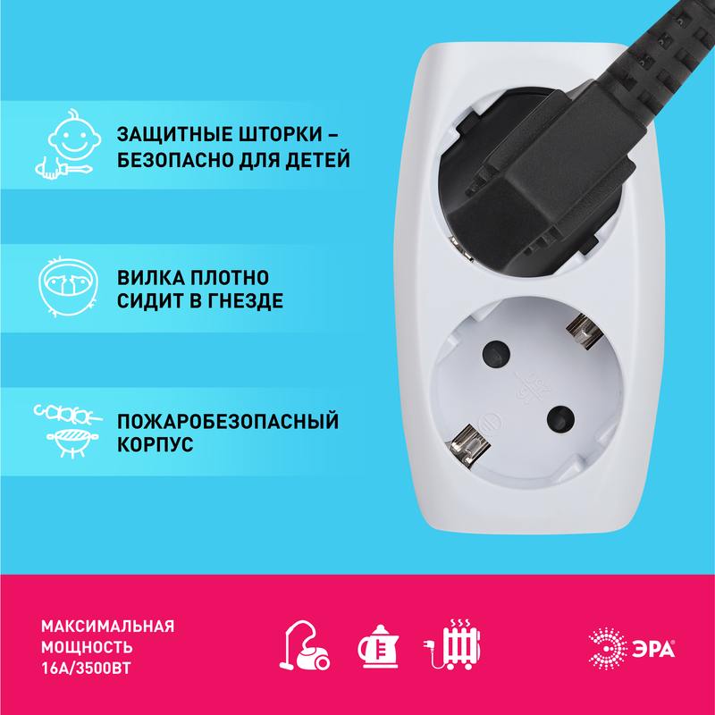 Разветвитель электрический Эра SP-2e-W с заземлением, 2 розетки, белый. Если в Вашем доме недостаточно розеток, чтобы одновременно подключить несколько электроприборов, то тройник марки Эра станет Вашим надежным помощником. Электрический разветвитель расчитан на максимальную мощность 16А/3500Вт. Корпус выполнен из ударопрочного и негорючего пластика (поликарбонат). Модель тройника на 16А позволяет подключить мощные бытовые приборы общей нагрузкой до 3500Вт. Не бойтесь включить чайник, обогреватель или микроволновку. Дизайн разработан в России командой Эра Style.