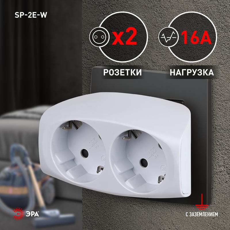 Характеристики Разветвитель электрический ЭРА SP-2e-W на 2 розетки с заземлением со шторками 16А белый: