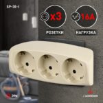 Характеристики Разветвитель электрический ЭРА SP-3e-I на 3 розетки c заземлением со шторками 16А слоновая кость: