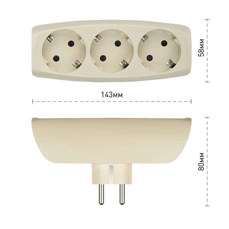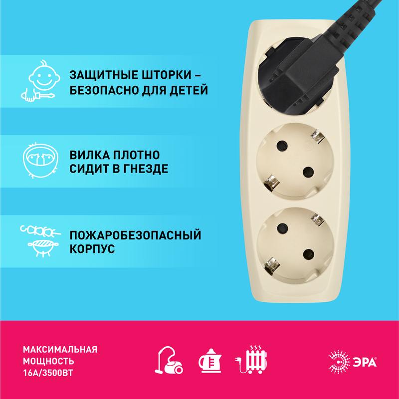 Разветвитель электрический Эра SP-3e-I с заземлением, 3 розетки, слоновая кость. Если в Вашем доме недостаточно розеток, чтобы одновременно подключить несколько электроприборов, то тройник марки Эра станет Вашим надежным помощником. Электрический разветвитель расчитан на максимальную мощность 16А/3500Вт. Корпус выполнен из ударопрочного и негорючего пластика (поликарбонат). Модель тройника на 16А позволяет подключить мощные бытовые приборы общей нагрузкой до 3500Вт. Не бойтесь включить чайник, обогреватель или микроволновку. Дизайн разработан в России командой Эра Style.