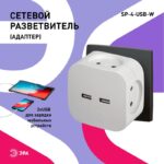 Характеристики Разветвитель электрический ЭРА SP-4-USB-W на 4 розетки 220V + 2xUSB 2400mA, без заземл 10А (белый):