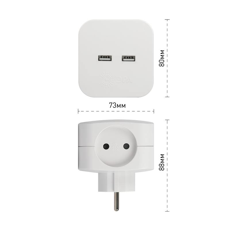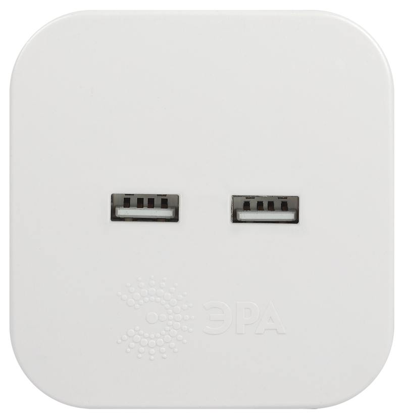 Тройник (адаптер) ЭРА с 4-мя розетками и 2-мя USB гнездами для зарядки портативных устройств. Новые тройники с USB собственного дизайна ЭРА отличаются эргономичным конструктивом и удобством в использовании. Идеален для зарядки мобильных телефонов и планшетов. Незаменим с собой в дороге. Особенно актуален, когда в помещении мало источников подключения — можно из одной розетки сделать четыре и при этом ещё заряжать 2 устройства одновременно через USB. Максимальная мощность USB разъемов: 2400 мА.