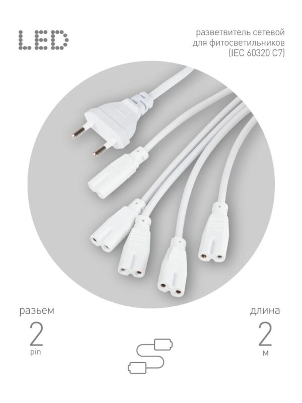 Характеристики Разветвитель сетевой для фитолампы ЭРА FITO 5х IEC C7 (2 pin) 2 м для подключения 5 светильников: