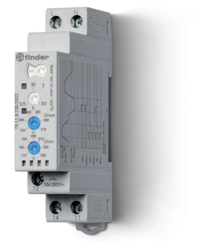 Характеристики Реле контрольное для 1-фазных сетей пониженное/повышенное напряжение настраиваемые диапазоны выход 1CO 10А модул. шир. 17.5мм FINDER 701182302022: