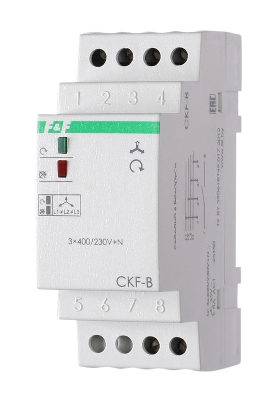 Реле контроля фаз серии «CKF» Монтаж на DIN-рейку. Предназначено для защиты электродвигателей и электроустановок, питаемых от трехфазной сети в случаях: отсутствия хотя бы одной из фаз, асимметрии напряжения, нарушения чередования фаз, обрыва нулевого провода. Принцип работы Если напряжение в пределах нормы, контакты исполнительного реле замкнуты и на контактор управления электродвигателем подается напряжение, управляющее его включением. В случае одной из вышеперечисленных аварийных ситуаций контакты реле размыкаются и контактор отключается. Включение происходит автоматически после восстановления сетевого напряжения питания. Особенности: контроль наличия фаз; контроль асимметрии между фазами; контроль чередования фаз; защита от обрыва нулевого провода; напряжение питания 3×230+N В AC; контакт — 1NO (8 А).