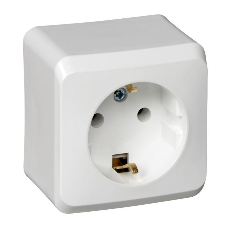 Розетка ЭТЮД (белый, открытой установки) одноместная с заземлением, без шторок предназначена для применения в сетях до 250В, на ток до 16А. Заземление обеспечивает безопасность при косвенном прикосновении. Она проста в установке и удобна в применении. Сделано в России.