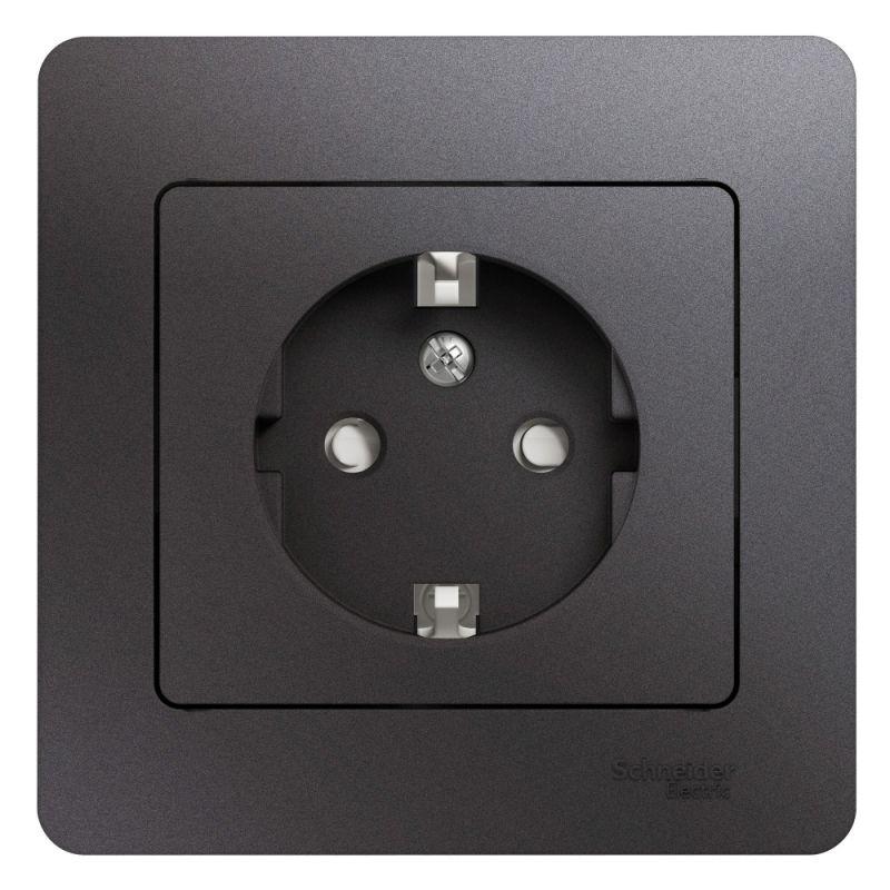 Розетка Glossa (в сборе, цвет графит) одинарная с заземлением и без шторок подходит для сетей 250 В, на ток 16 А. — Заземляющий контакт обеспечивает дополнительную защиту от удара электрическим током. При наличии заземления электрический потенциал уходит в землю, защищая человека. — Выполнен из материала PС+ASA, стойкого к УФ-излучению и появлению царапин. — Эргономичные клеммы розеток расположены в один ряд.
