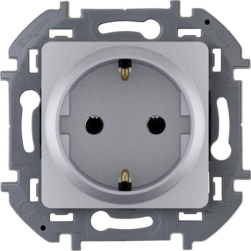 Розетка с заземлением Legrand Inspiria для скрытого монтажа , цвет «Алюминий». Максимальный ток 16 А, напряжение ~250В, максимальная мощность 3680 Вт. Применяется для электропитания в зданиях с проводкой с заземлением (с защитным проводником). Особенности изделия: — Контактная группа изготовлена из высококачественной латуни CuZn37, имеет высокую степень упругости и сохраняет плотный контакт с вилкой, при длительной эксплуатации. — Зажимы для присоединения проводников винтовые П-образной формы для исключения бокового выдавливания провода. — В зажимах установлены качественные винты с никель-цинковым напылением для надежного резьбового соединения даже при чрезмерных моментах затяжки. — Защитный контакт с широким основанием и специальным профилем для упругости при подключении/отключении и плотного контакта с вилкой. — Лицевая панель крепится на защелках. Изготовлена из прочного глянцевого поликарбоната, стойкого к механическим воздействиям, выгоранию и загрязнениям.