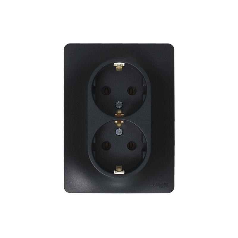 Розетка двойная Glossa (в сборе, цвет антрацит) с заземлением, без шторок подходит для сетей 250 В, на ток 16 А. — Заземляющий контакт обеспечивает дополнительную защиту от удара электрическим током. При наличии заземления электрический потенциал уходит в землю, защищая человека. — Выполнен из материала PС+ASA, стойкого к УФ-излучению и появлению царапин. — Двойная розетка позволяет подключить два устройства в одном месте.