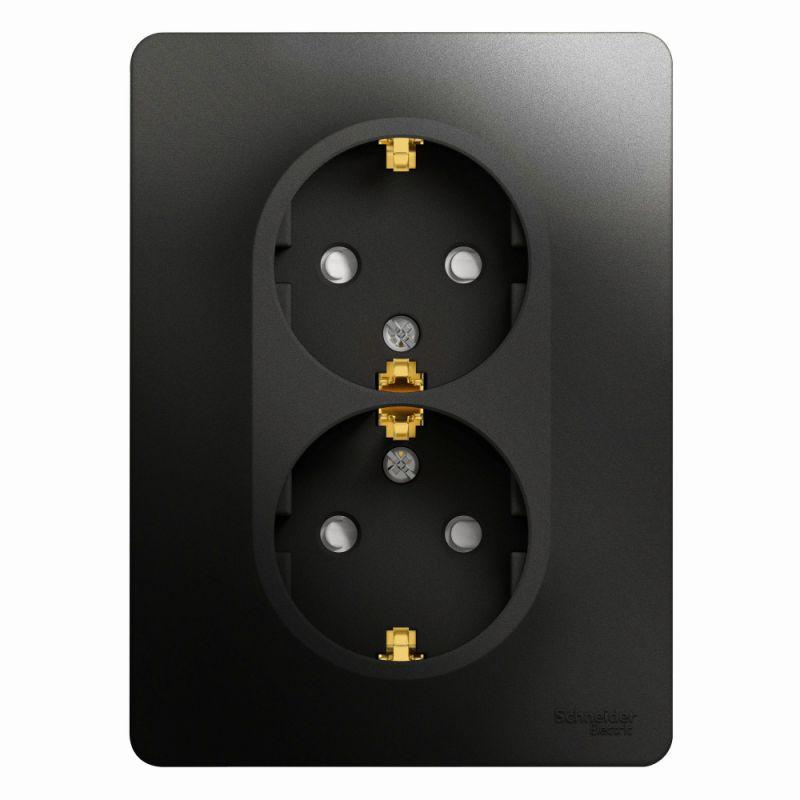 Розетка двойная Glossa (в сборе, цвет антрацит) с заземлением и шторками подходит для сетей 250 В, на ток 16 А. — Заземляющий контакт обеспечивает дополнительную защиту от удара электрическим током. При наличии заземления электрический потенциал уходит в землю, защищая человека. — Выполнен из материала PС+ASA, стойкого к УФ-излучению и появлению царапин. — Двойная розетка позволяет подключить два устройства в одном месте.