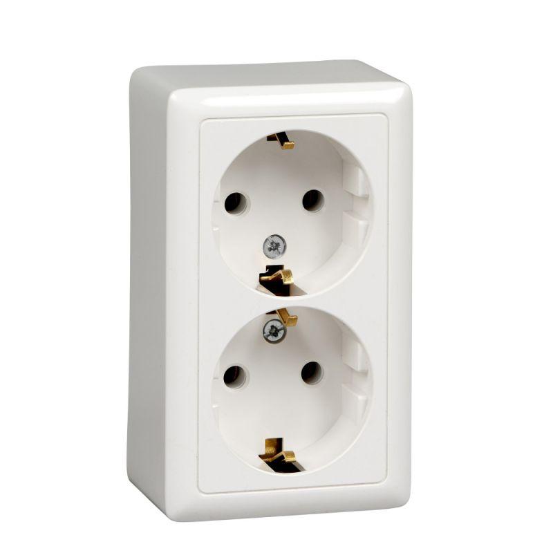 Розетка ХИТ (открытой установки, цвет белый) двойная с заземлением, с изолирующей пластиковой пластиной без шторок предназначена для сетей до 250 В на ток до 16 А. — Двойная розетка позволяет подключить два устройства в одном месте. — Заземляющий контакт обеспечивает дополнительную защиту от удара электрическим током. При наличии заземления электрический потенциал уходит в землю, защищая человека. — Сделано в России.