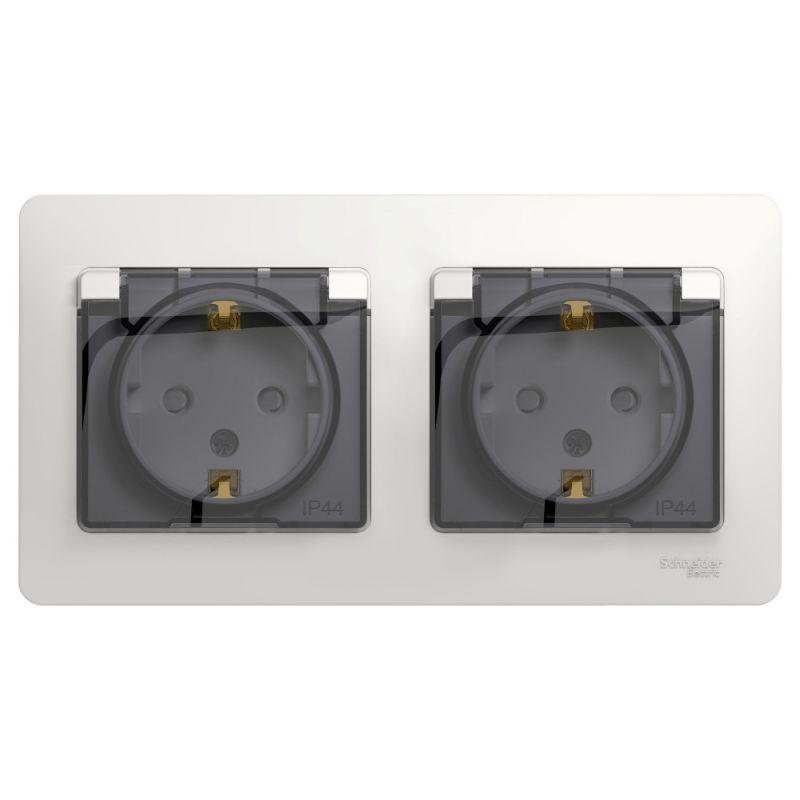 Розетка Glossa (в сборе, цвет белый) двойная с заземлением, шторками и крышкой подходит для сетей 250 В, на ток 16 А. — Изделие со степенью защиты IP44 обеспечит безопасность использования в ванной и на кухне. — Заземляющий контакт обеспечивает дополнительную защиту от удара электрическим током. При наличии заземления электрический потенциал уходит в землю, защищая человека. — Выполнен из материала PС+ASA, стойкого к УФ-излучению и появлению царапин.