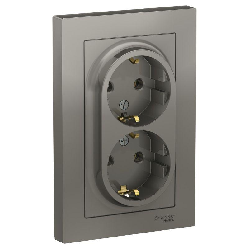 Розетка двойная AtlasDesign (в сборе, цвет сталь) с заземлением, без шторок подходит для сетей 250 В, на ток 16 А. — Заземляющий контакт обеспечивает дополнительную защиту от удара электрическим током. — Лицевые детали из качественного ABS-пластика, устойчивого к царапинам и УФ-излучению. — Двойная розетка позволяет подключить два устройства в одном месте. — Изделие поставляется в комплекте с рамкой того же цвета.