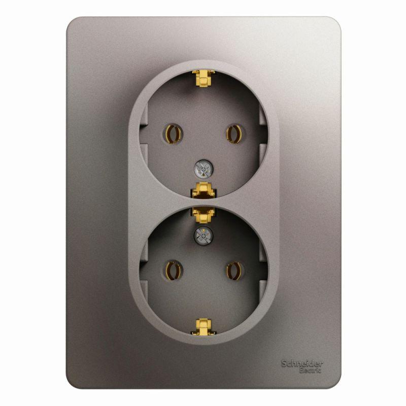 Розетка двойная Glossa (в сборе, цвет платина) с заземлением, без шторок подходит для сетей 250 В, на ток 16 А. — Заземляющий контакт обеспечивает дополнительную защиту от удара электрическим током. При наличии заземления электрический потенциал уходит в землю, защищая человека. — Выполнен из материала PС+ASA, стойкого к УФ-излучению и появлению царапин. — Двойная розетка позволяет подключить два устройства в одном месте.