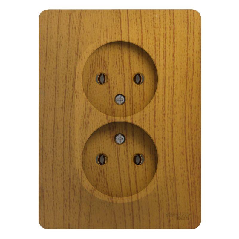 Розетка двойная Glossa (в сборе, цвет дерево дуб) без заземления и без шторок подходит для сетей 250 В, на ток 16 А. — Выполнен из материала PС+ASA, стойкого к УФ-излучению и появлению царапин. — Эргономичные клеммы розеток расположены в один ряд. — Двойная розетка позволяет подключить два устройства в одном месте.