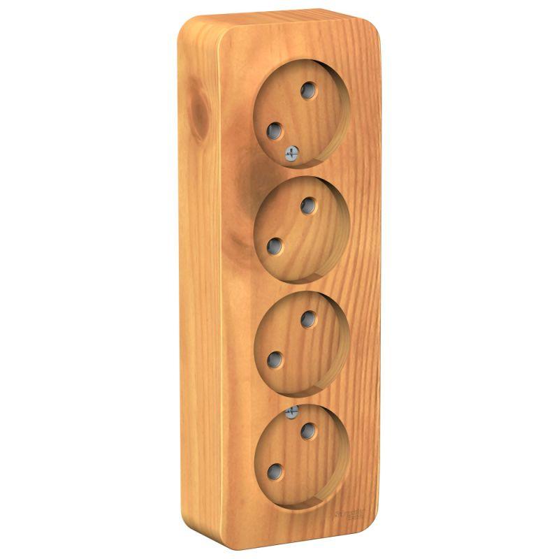 Розетка BLANCA (ясень, открытой установки) четырехместная, без шторок и заземления, с изолирующей пластиной предназначена для сетей до 250В, на ток до 16А. четырехместная розетка позволяет подключить четыре устройства в одном месте. Изделия цвета Ясень обладают уникальным рисунком, напоминающим древесный сруб. Она изготовлена из ABS-пластика, проста в установке и удобна в применении.