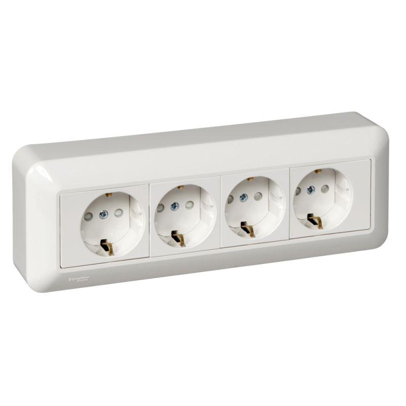 Розетка четырёхместная Systeme Electric (ранее Schneider Electric) BLANCA (открытой установки, цвет белый) с заземлением и со шторками, с монтажной стальной пластиной предназначена для сетей до 250 В на ток до 16 А. — Четырёхместная розетка позволяет подключить четыре устройства в одном месте. — Заземляющий контакт обеспечивает дополнительную защиту от удара электрическим током. При наличии заземления электрический потенциал уходит в землю, защищая человека. — Оптовая упаковка, сделано в России.