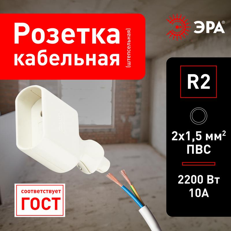 Характеристики Розетка ЭРА R2 кабельная без заземления 10A прямой ввод белая:
