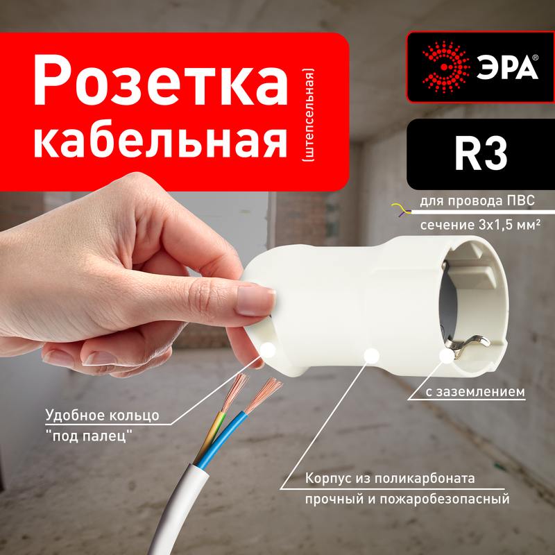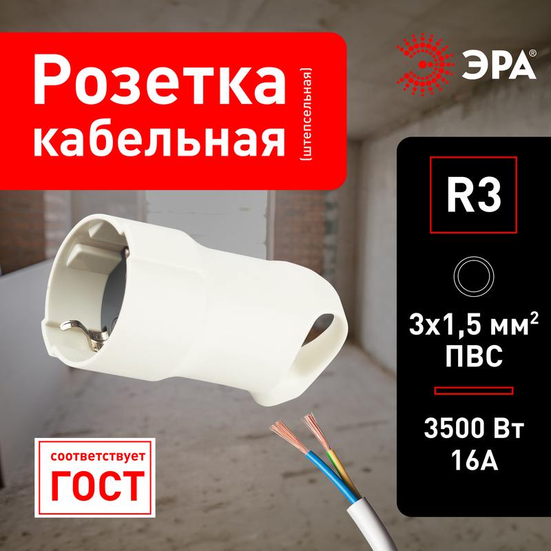 Розетка штепсельная ЭРА R3, c заземлением, максимальная мощность — 16A/3500Вт (кабель до 3×1,5мм2).