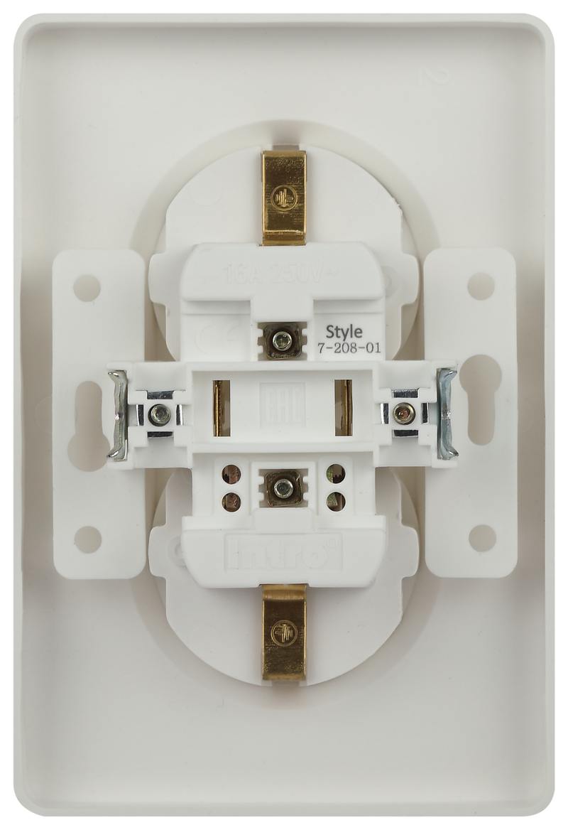 Розетка двойная с заземлением со шторками серии Intro ST скрытой установки цвет белый 7-208-01. Номинальные характеристики 16А 250В . Розетка выполнена из пластика, укомплектована одноместной рамкой, оснащена винтовыми клеммами. Клеммы с двумя отверстиями позволяют соединять соседние розетки шлейфом. Установка в подрозетник производится как на монтажные лапки, так и на винты.