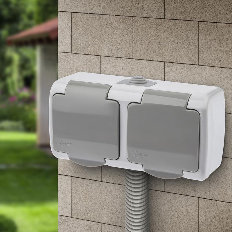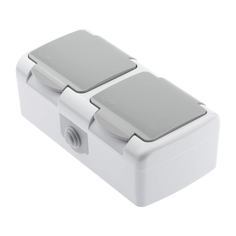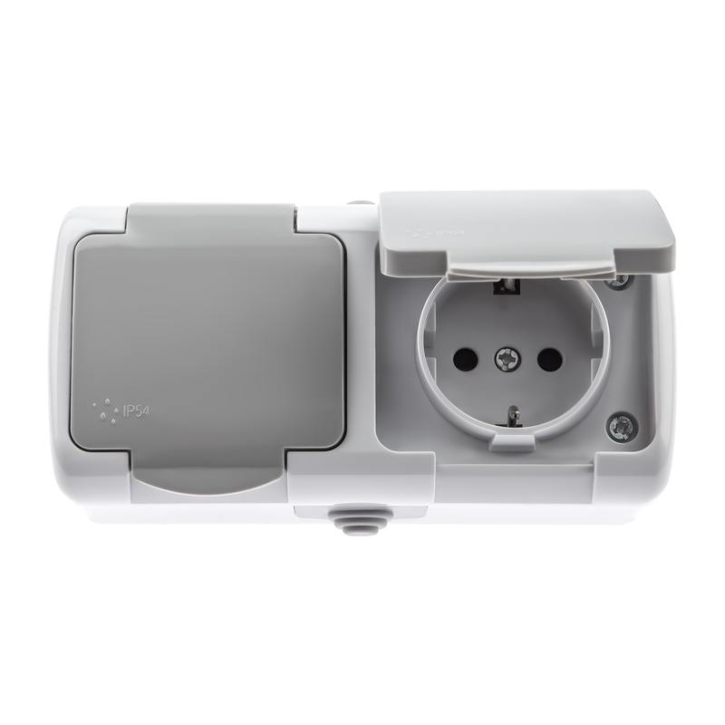 Характеристики Розетка Intro Atlantic 5-204-03 двойная с заземлением 2х2P+E Schuko шторки, 16А-250В, IP54, открытой установки, серый: