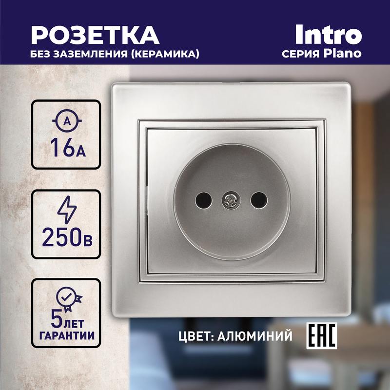Характеристики Розетка Intro Plano 1-201-03 без заземления 2P, 16А-250В, IP20, СУ, алюминий: