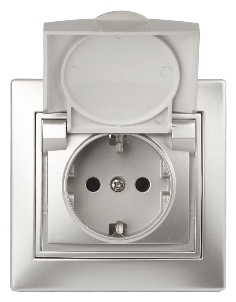 Характеристики Розетка Intro Plano 1-203-03 с заземлением 2P+E Schuko с крышкой, 16А-250В, IP20, СУ, алюминий: