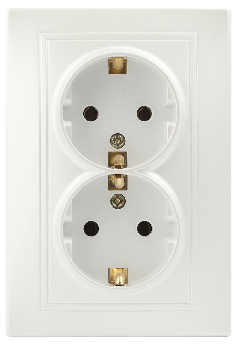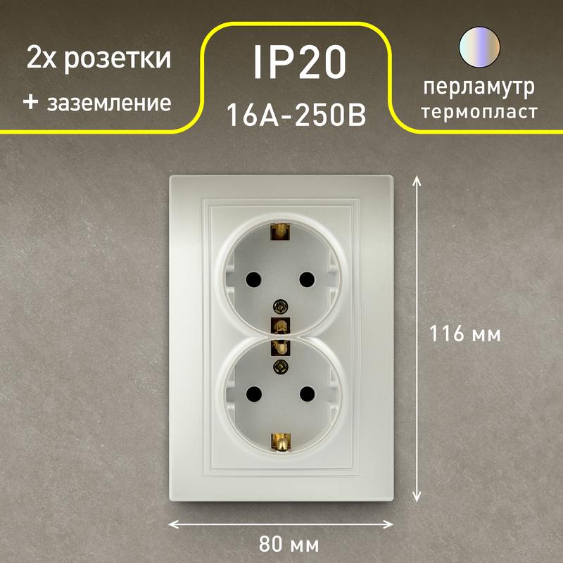 Характеристики Розетка Intro Plano 1-205-06 с заземлением двойная 2X2P+E Schuko, 16А-250В, IP20, СУ, перламутр: