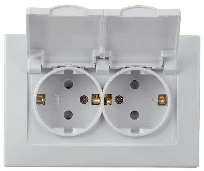 Характеристики Розетка Intro Plano 1-210-01 с заземлением двойная 2х2P+E Schuko с крышкой шторками, 16А-250В, СУ, IP44, белый: