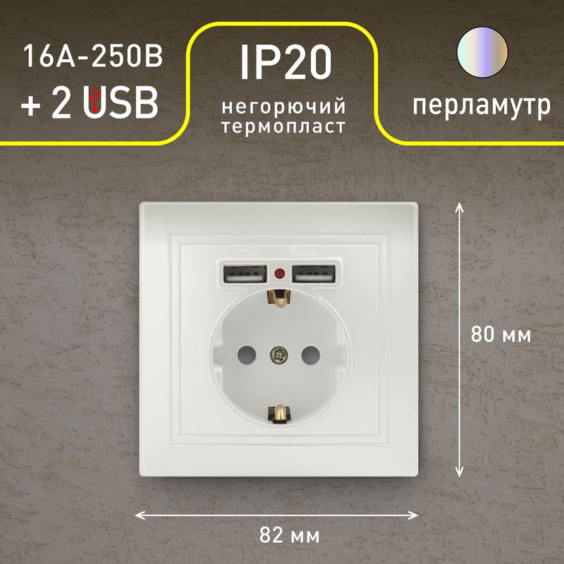 Характеристики Розетка Intro Plano 1-410-06 с заземлением 2P+E Schuko со шторками, 16А-250В + 2хUSB 5В-2,1А, IP20, СУ, перламутр:
