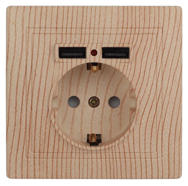 Розетка 2P+E Schuko со шторками, 16А-250В + 2хUSB 5В-2,1А, IP20, СУ, сосна Intro Plano 1-410-11