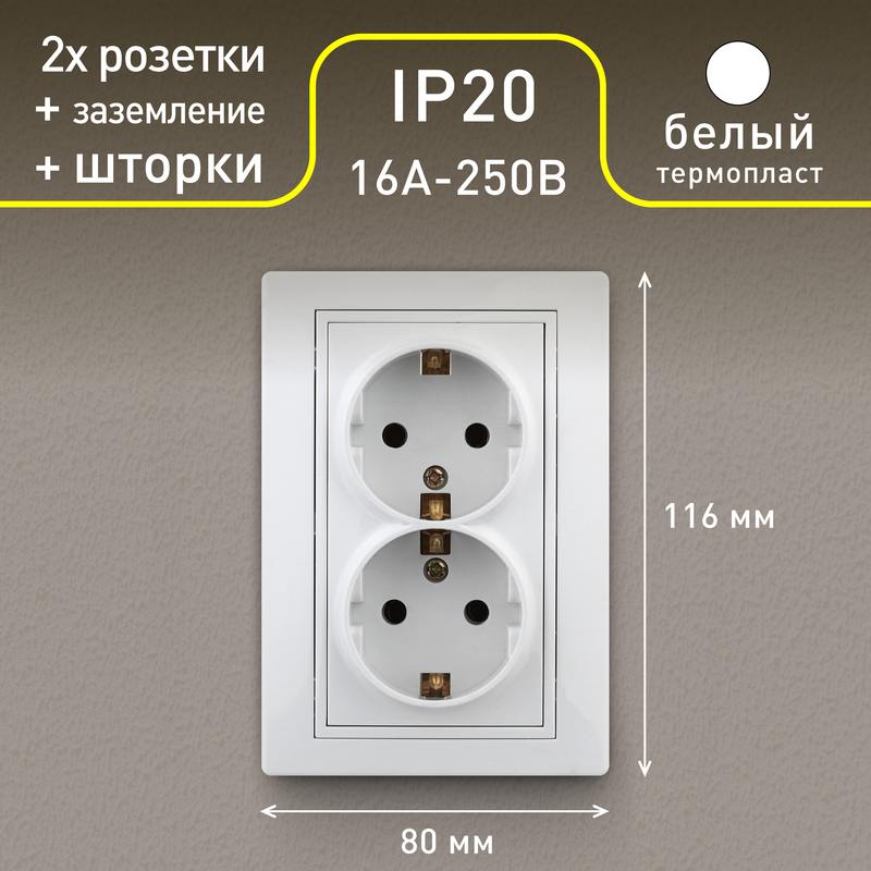 Розетка двойная с заземлением 2X2P+E Schuko со шторками, 16А-250В, IP20, СУ, б.л., белый Intro Plano 1Э-208-01