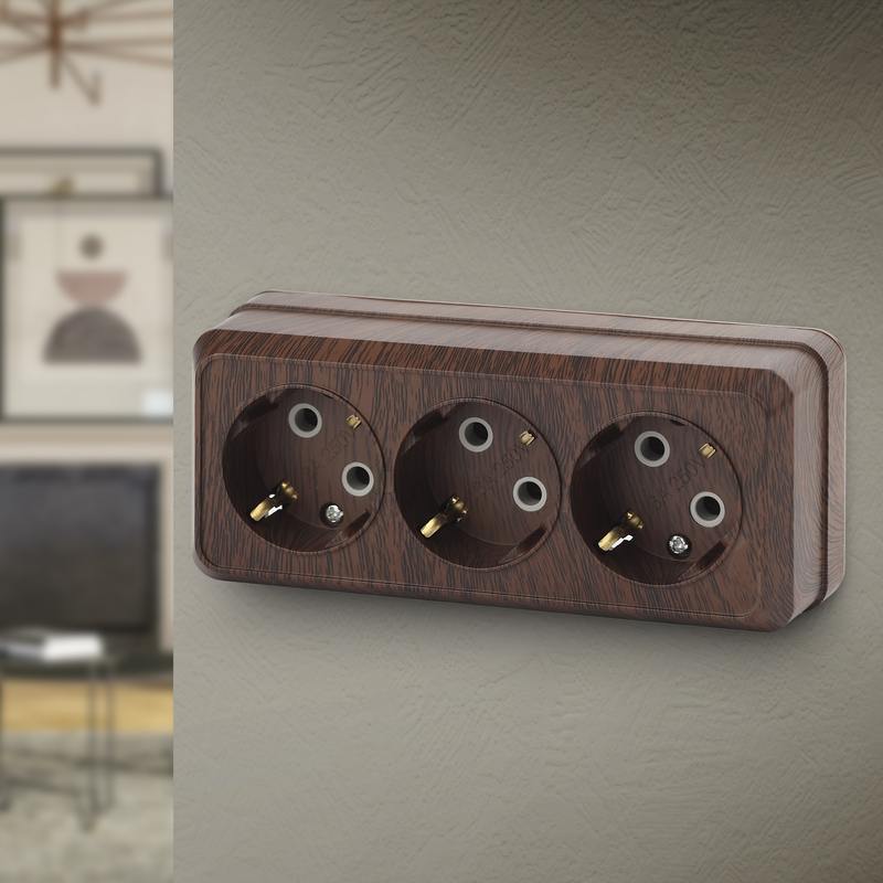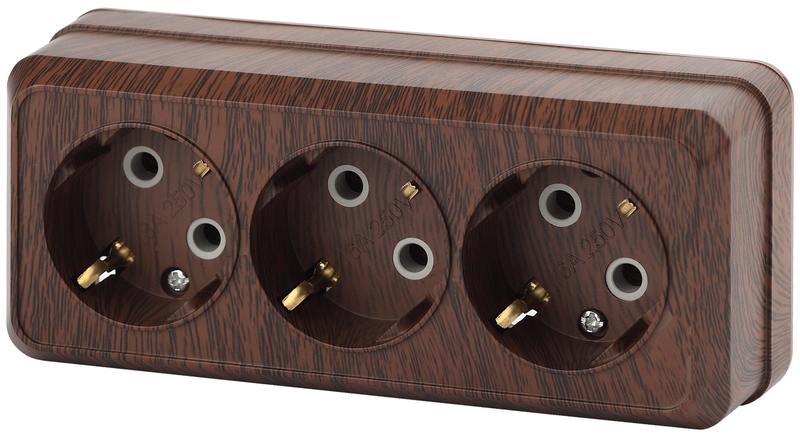 Розетка Intro Quadro 2-206-10 с заземлением трехместная 3х2P+E, 16А-250В, IP20, ОУ, венге
